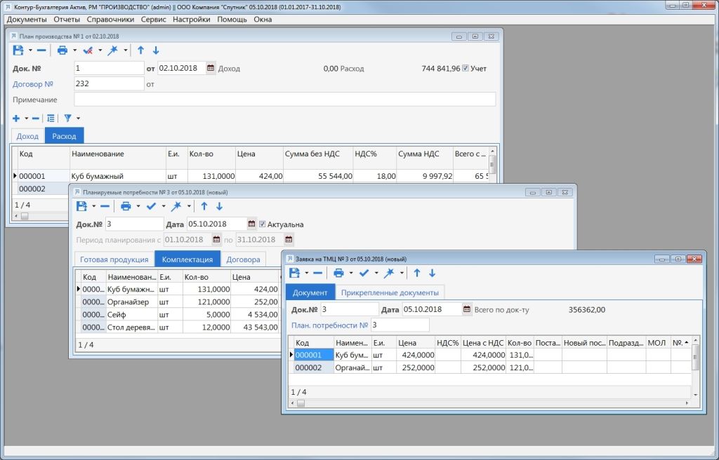 С помощью функции «Производство» в программе можно: задавать спецификацию продукции, формировать заявки на закупку материалов по плану, создавать план выпуска продукции и так далее.