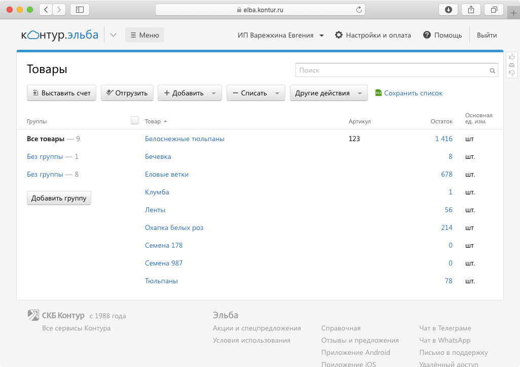 В Контур.Эльба можно создавать карточки товаров с группировкой по категориям. Так можно отслеживать количество товара на складе на основе первичных документов.