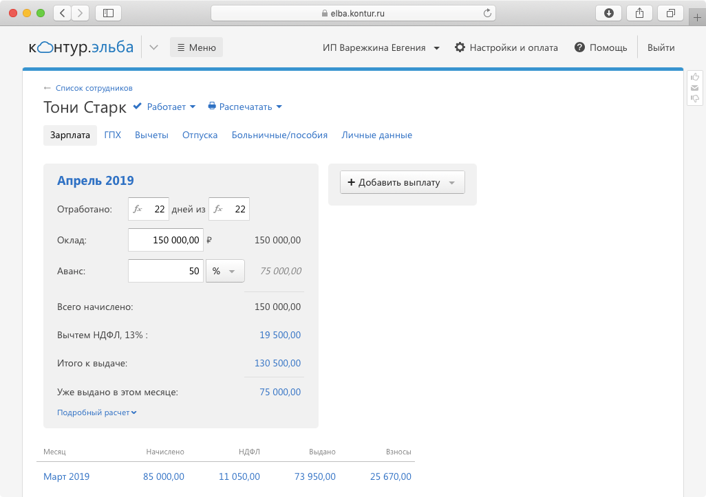 Если у вас есть сотрудники, Эльба автоматически рассчитает все необходимые налоги и взносы, а также создаст необходимые отчётные документы: СЗВ-М, расчёт по страховым взносам, 4-ФСС, 6-НДФЛ, 2-НДФЛ, СЗВ-СТАЖ и ССЧ. Вся информация дублируется в карточке сотрудника.