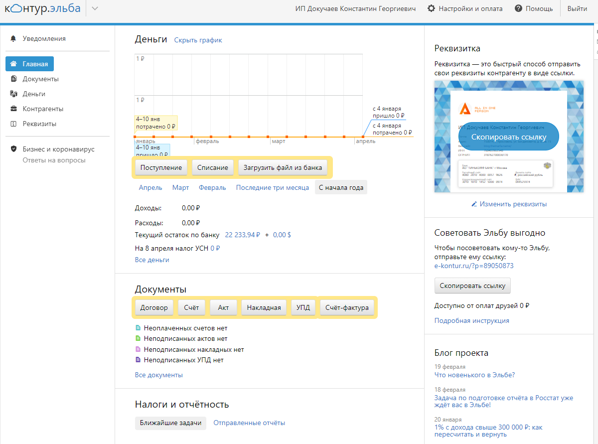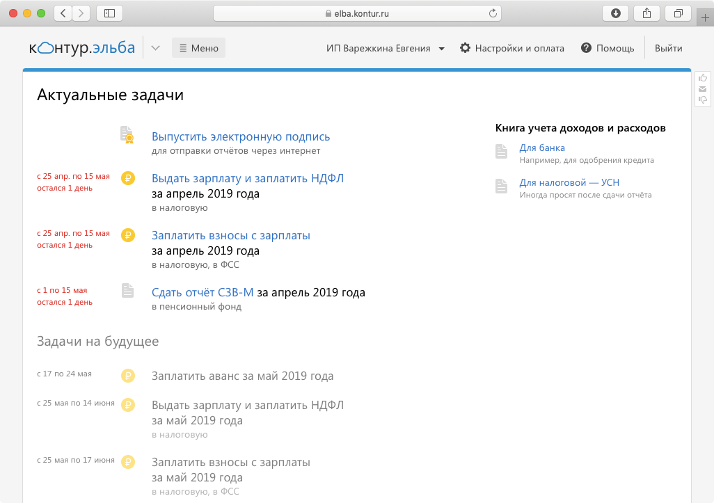 Начну с главного. Новые ИП без сотрудников могут целый год пользоваться сервисом бесплатно. Поэтому если вы ещё не знаете, подойдёт ли вам Эльба, и не хотите тратить деньги зря, то у вас есть куча времени на тестирование сервиса.