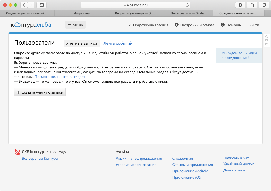 В Контур.Эльба есть поддержка совместной работы. Вы и ваши сотрудники сможете создавать счета, акты и накладные, инициировать проверку контрагентов, закрывать счета. А администратор будет видеть и контролировать все выполненные действия.