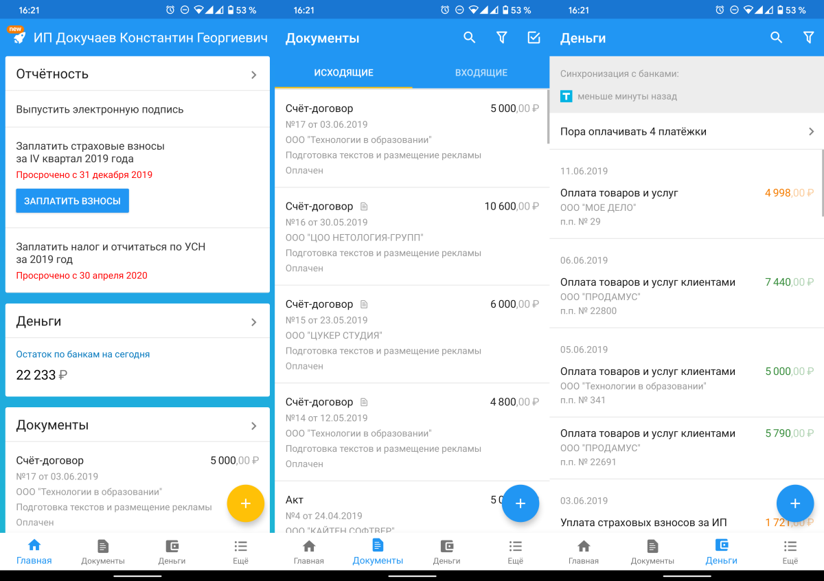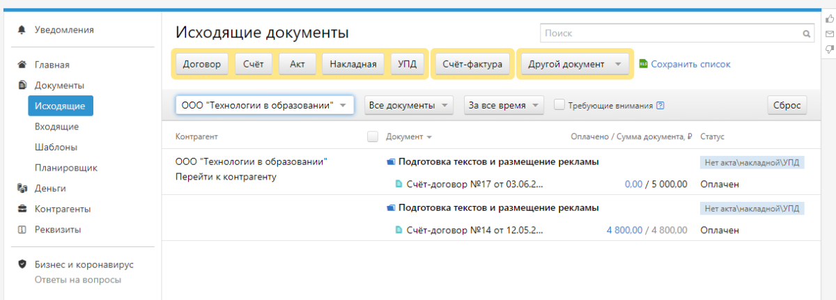 Как я писал выше, в этом разделе можно быстро выставить контрагентам счета, акты, накладные, счёт-фактуры и договоры по собственным или готовым шаблонам. И самое крутое, что эти же возможности доступны из мобильного приложения.
