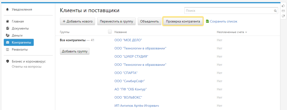 А в разделе Контрагенты собрана вся информация по вашим контрагентам. Отсюда можно быстро перейти к созданию карточки нового контрагента, объединить их в группы или запустить проверку контрагента на кошерность.