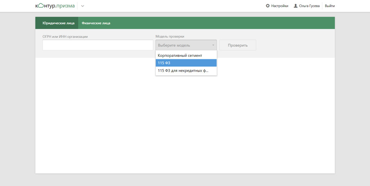 Контур.Призма — это сервис, который позволяет ускорить проверку клиентов согласно требованиям ФЗ No115-ФЗ, а также выполняет проверку транзакционных операций на предмет обналичивания, осуществляет оценку компании по широкому набору критериев риска. Проверка выполняется по более 70 критериям, данные берутся из разных источников.