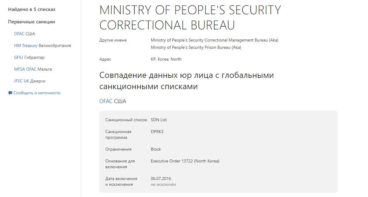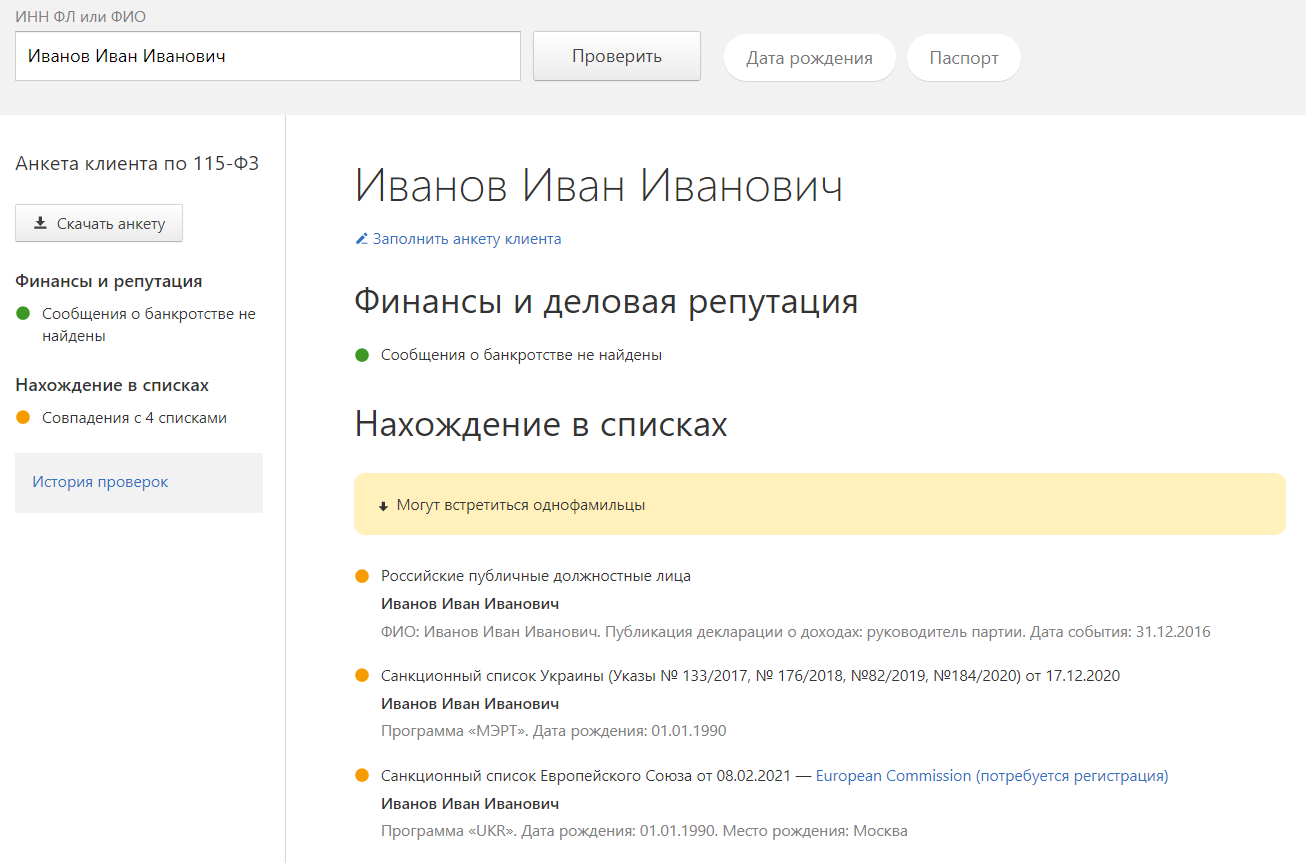 Если совпадения были обнаружены в каком-либо из списков, то система покажет дату внесения и мотив.