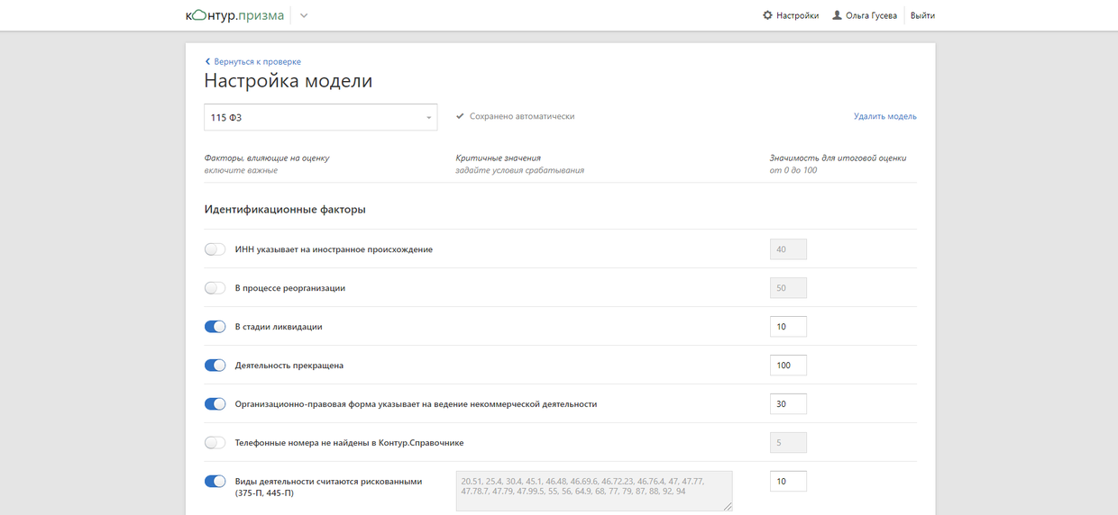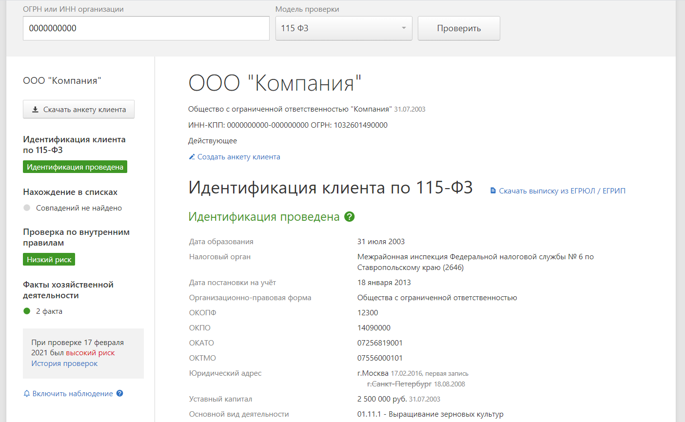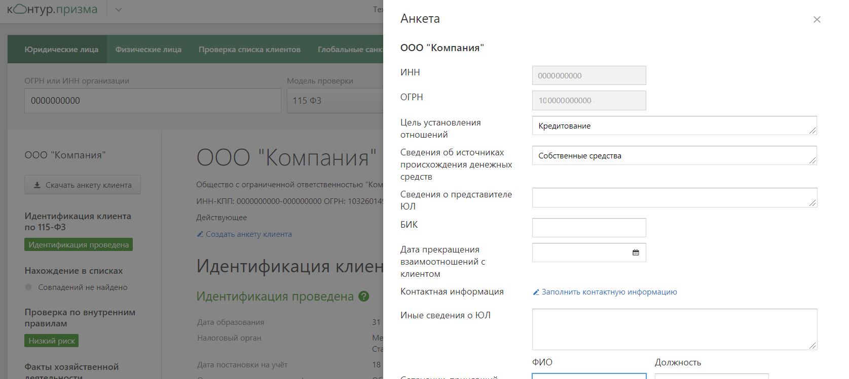 В обязанности всех организаций входит предварительная идентификация клиентов перед началом сотрудничества и постоянное обновление базы данных. Контур.Призма проводит контроль автоматически для каждого клиента на основе параметров, предусмотренных 115-ФЗ.