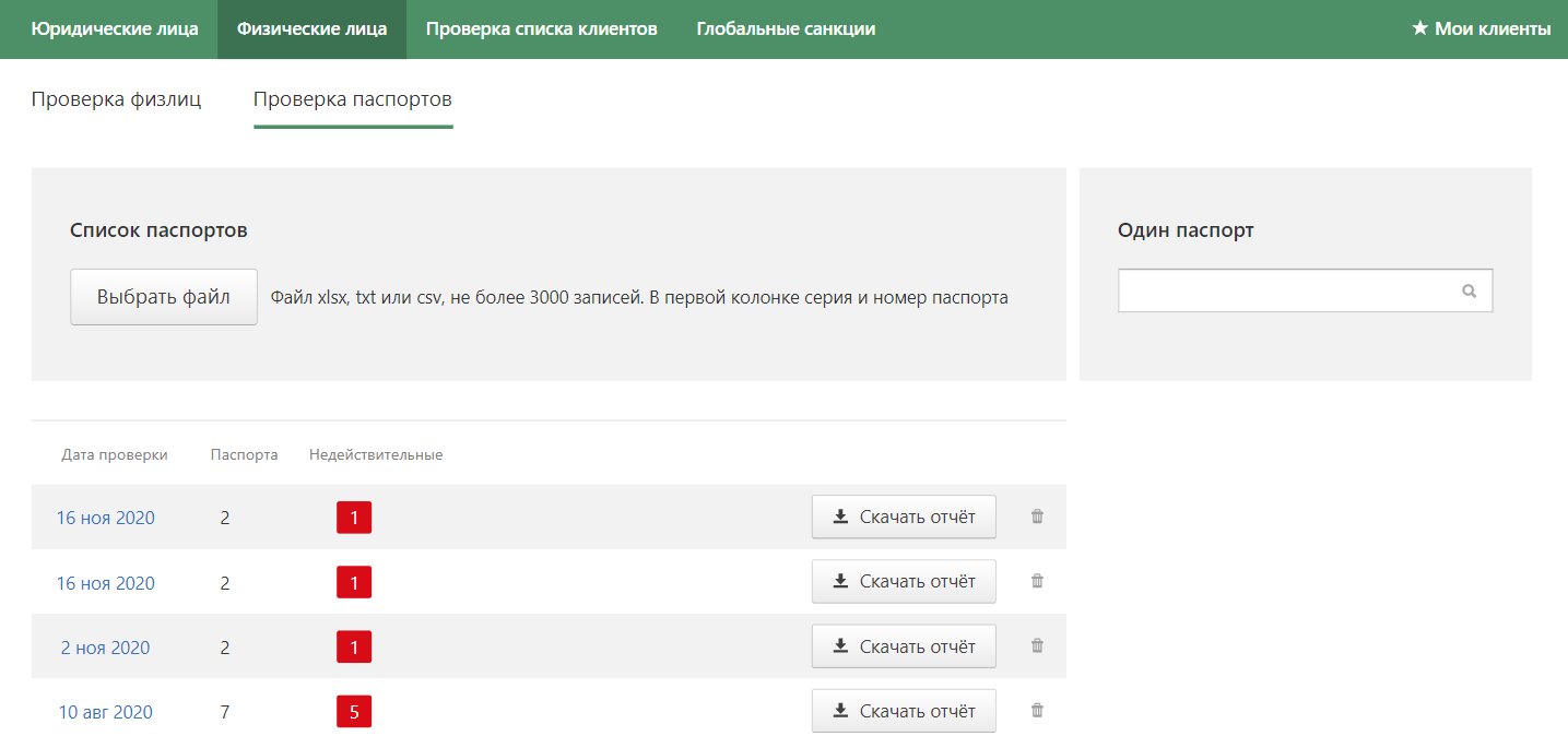 Контур.Призма предоставляет функцию проверки паспорта. Для этого надо ввести серийный номер паспорта в специальной вкладке. Проверка покажет утраченные, похищенные, оформленные на утраченных или похищенных бланках и признанные недействительными паспорта.
