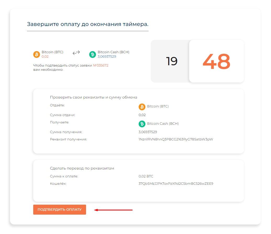 Вам нужно перевести указанную сумму на кошелёк обменника и нажать кнопку «Оплата завершена». После подтверждения транзакции через какое-то время деньги появятся в вашем кошельке.
