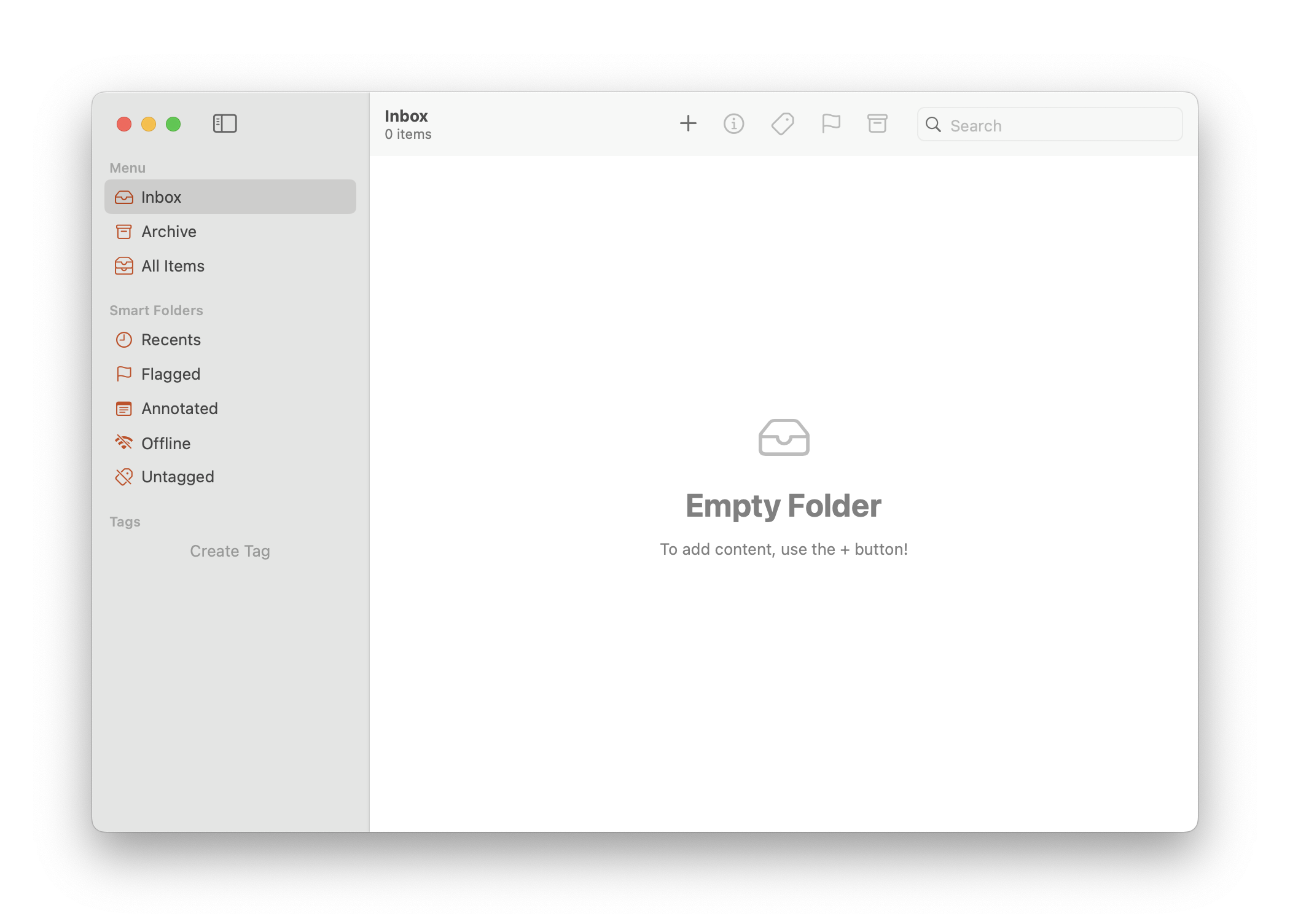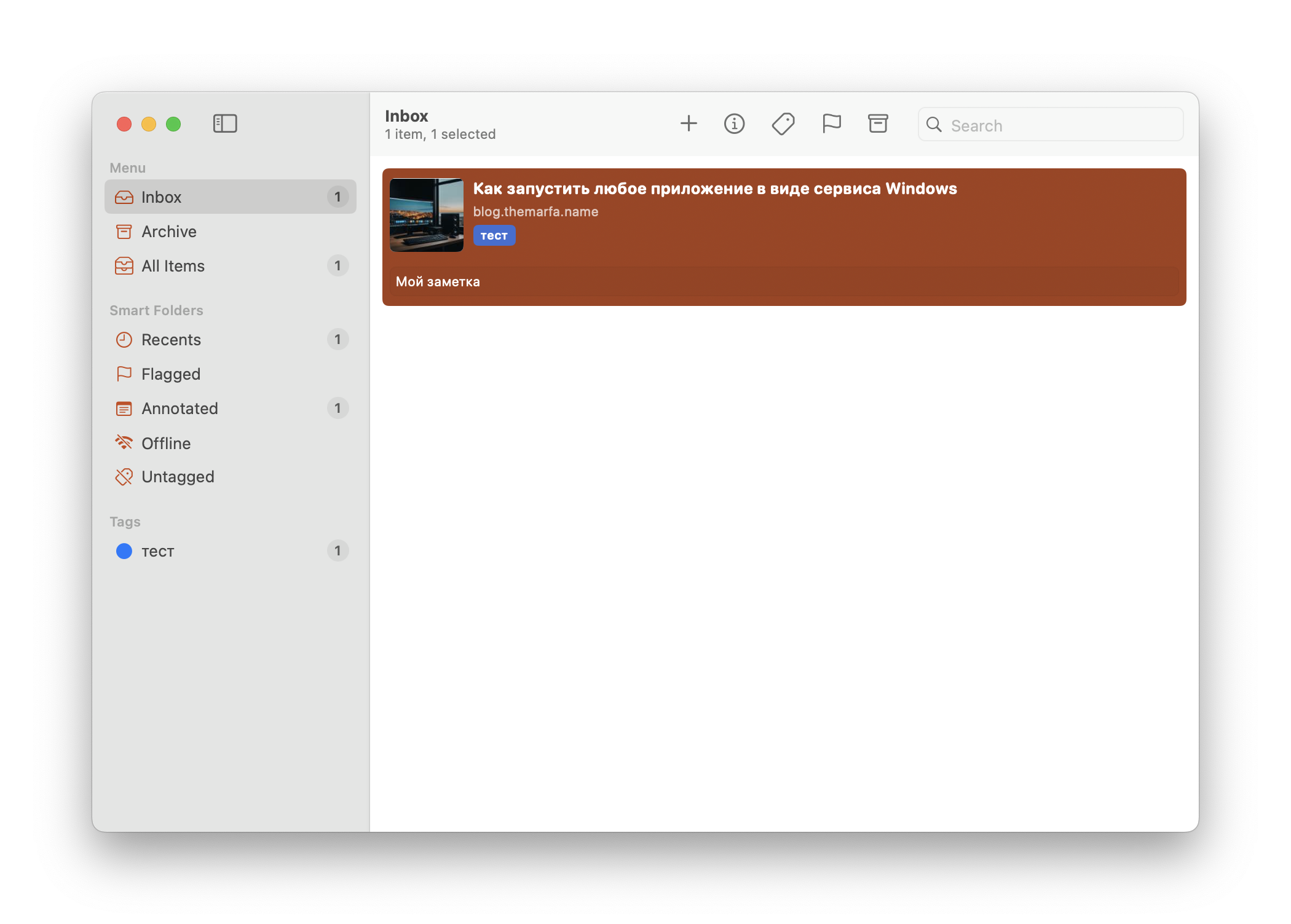 Интерфейс приложения поделён на два раздела. Слева находится панель навигации для просмотра ваших ссылок: входящие, архив, все записи. Также можно пользоваться поиском по содержимому или фильтрами: недавние, помеченные, с заметкой, офлайн, без тегов. На правой панели отображается содержимое выбранного контента.