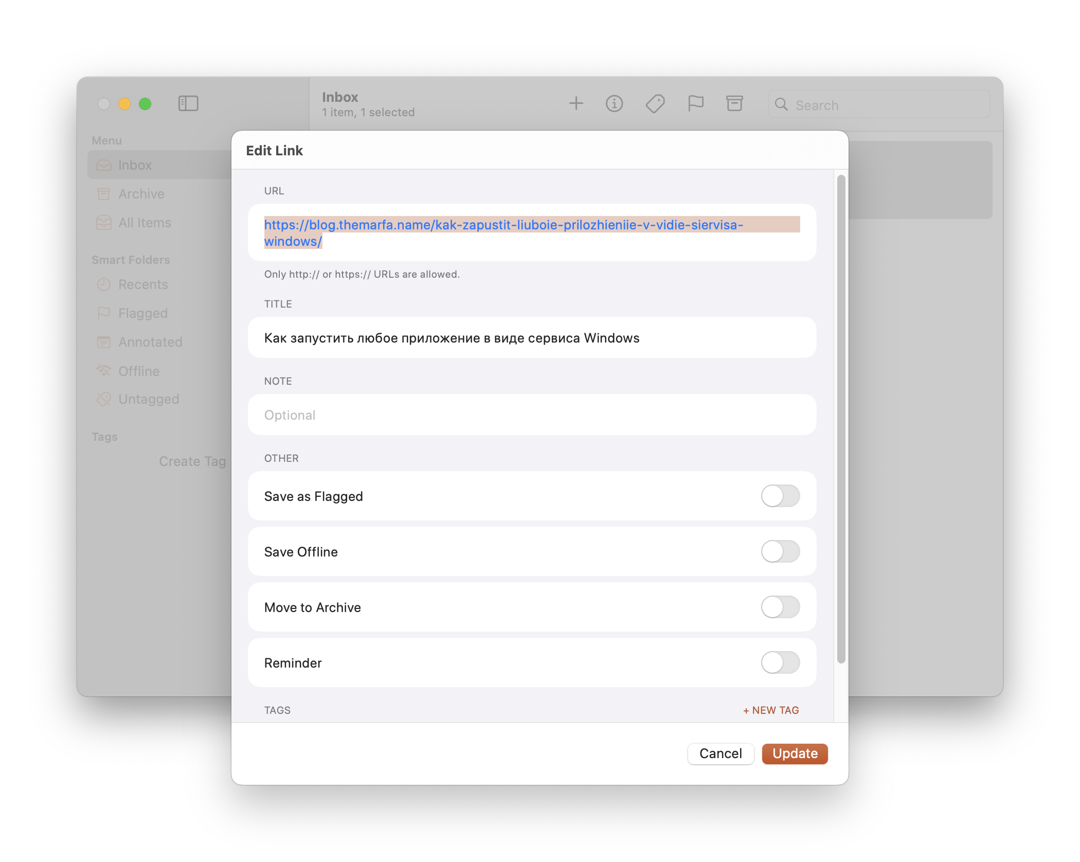 Добавленную ссылку можно отредактировать и поменять у неё название, добавить заметку, пометить флажком или тегом, сделать доступной в офлайне и добавить напоминание.