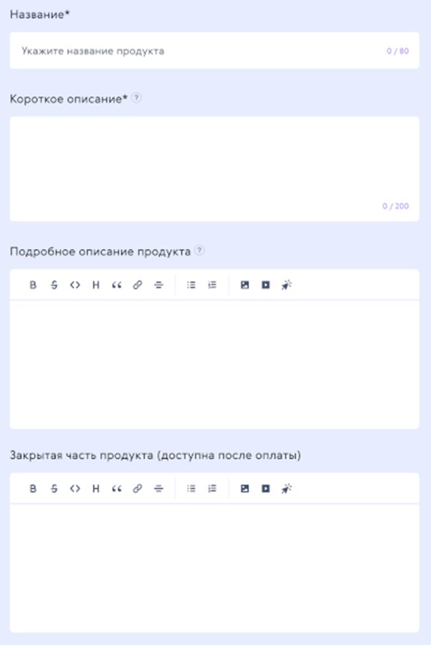 После выбора типа продукта нужно заполнить краткую информацию о нём: название, описание, закрытое содержание только для оплативших продукт или подписчиков. Для полей описания доступно форматирование текста и вставка файлов.