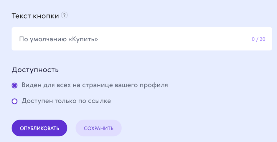Далее нужно добавить текст для кнопки (например, Купить) и указать доступность продукта: для всех или по ссылке.