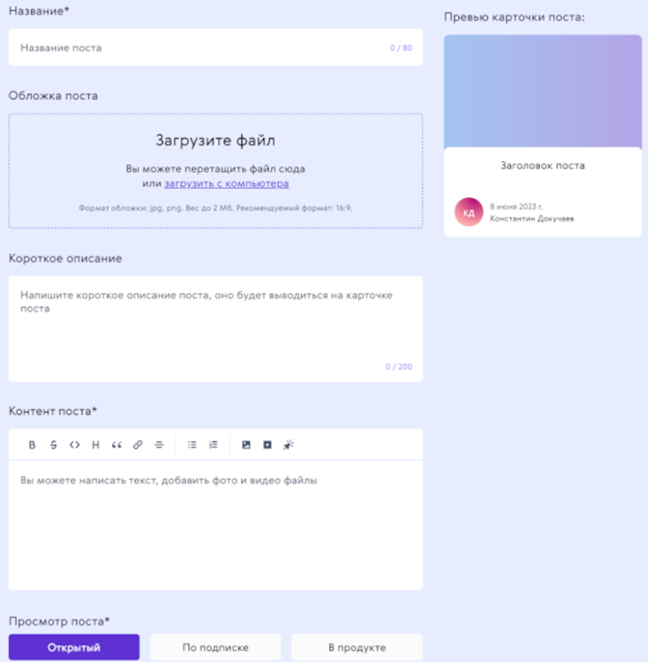 Здесь откроется редактор публикации, в котором можно указать название, добавить обложку, короткое описание и непосредственно настрочить сам пост.