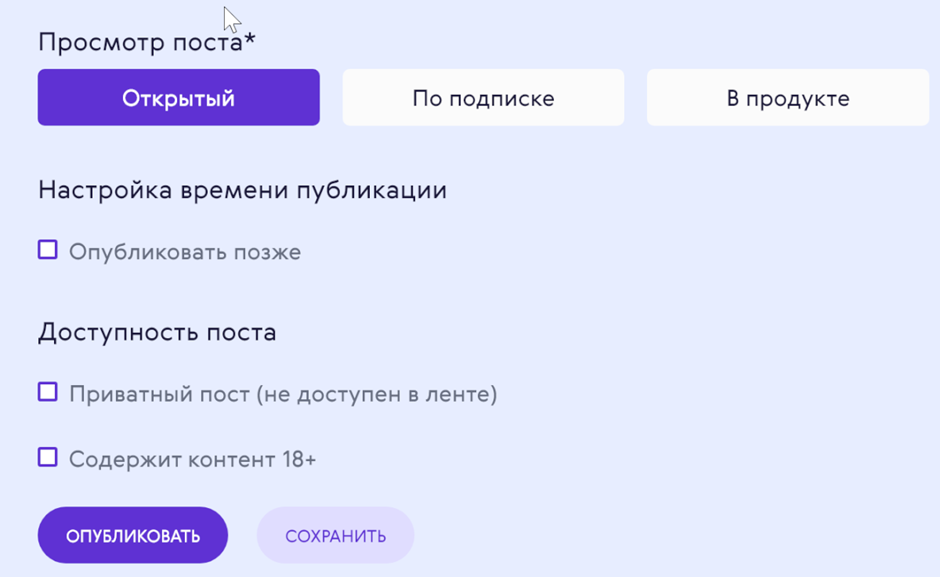 Публикацию можно запланировать на определённое время, а также скрыть из ленты или пометить, что контент предназначается для лиц не младше 18 лет.