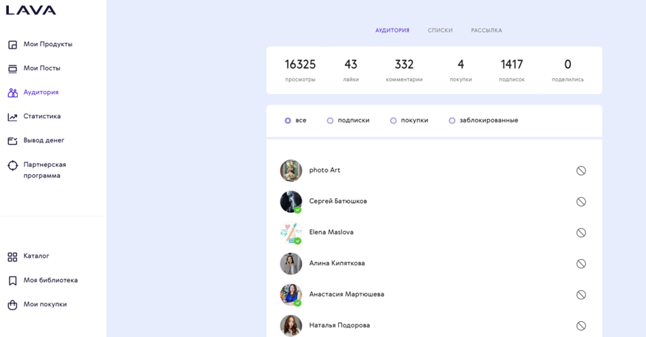 Для понимания того, сколько у вас платных подписчиков, в lava.top предусмотрен раздел Аудитория. Здесь отображаются данные о тех, кто приобрёл или подписался на ваш контент. А также отражена вся активность профиля.