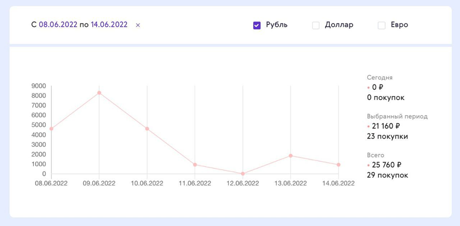 В разделе Статистика можно отслеживать изменение продаж продуктов и подписчиков. Есть фильтрация по валюте и датам, что позволяет отслеживать и прогнозировать ваш доход на платформе.