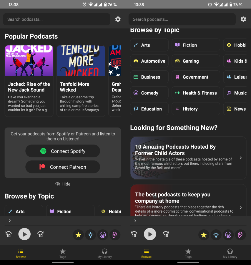Дополнительно можно поискать подкасты по одной из пары десятков тем или выбрать что-то из рекомендаций. Ещё можно импортировать подписки из Spotify или Patreon.