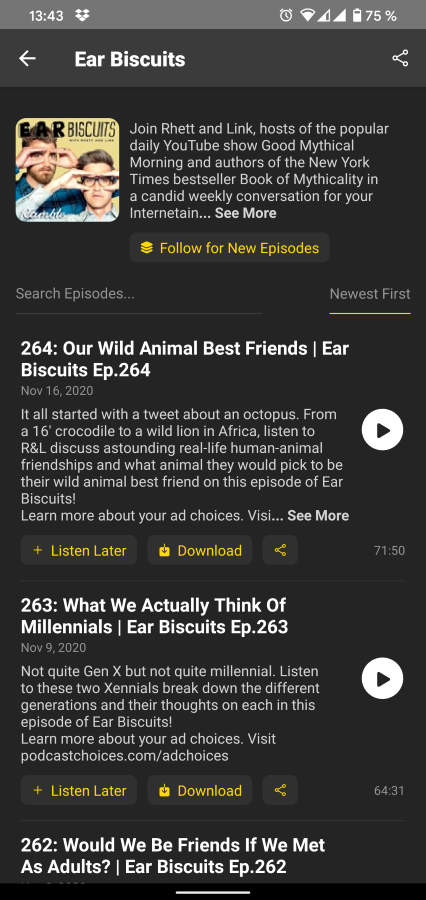 Из плейлиста подкаста можно на него подписаться, сохранить в офлайне или нажать Listen Later, чтобы сохранить эпизод в библиотеку. Доступен поиск эпизодов, сортировка и шеринг.