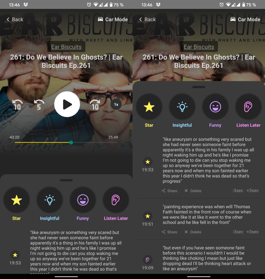 После этого Listener автоматически сохранит последние 10 секунд аудиозаписи в виде текста. А под самим эпизодом, рядом с выбранной пометкой, появится таймкод и сам текст. При тапе по карточке можно быстро перейти к выбранному моменту.