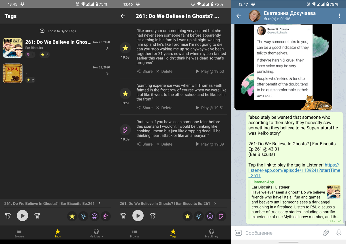 Также сохранённые моменты доступны в разделе Tags, который синхронизируется между устройствами. Сам момент в виде текста и таймкода можно отправить в любом мессенджере. К сожалению, сам эпизод в таком случае прослушать не удастся без установки Listener.