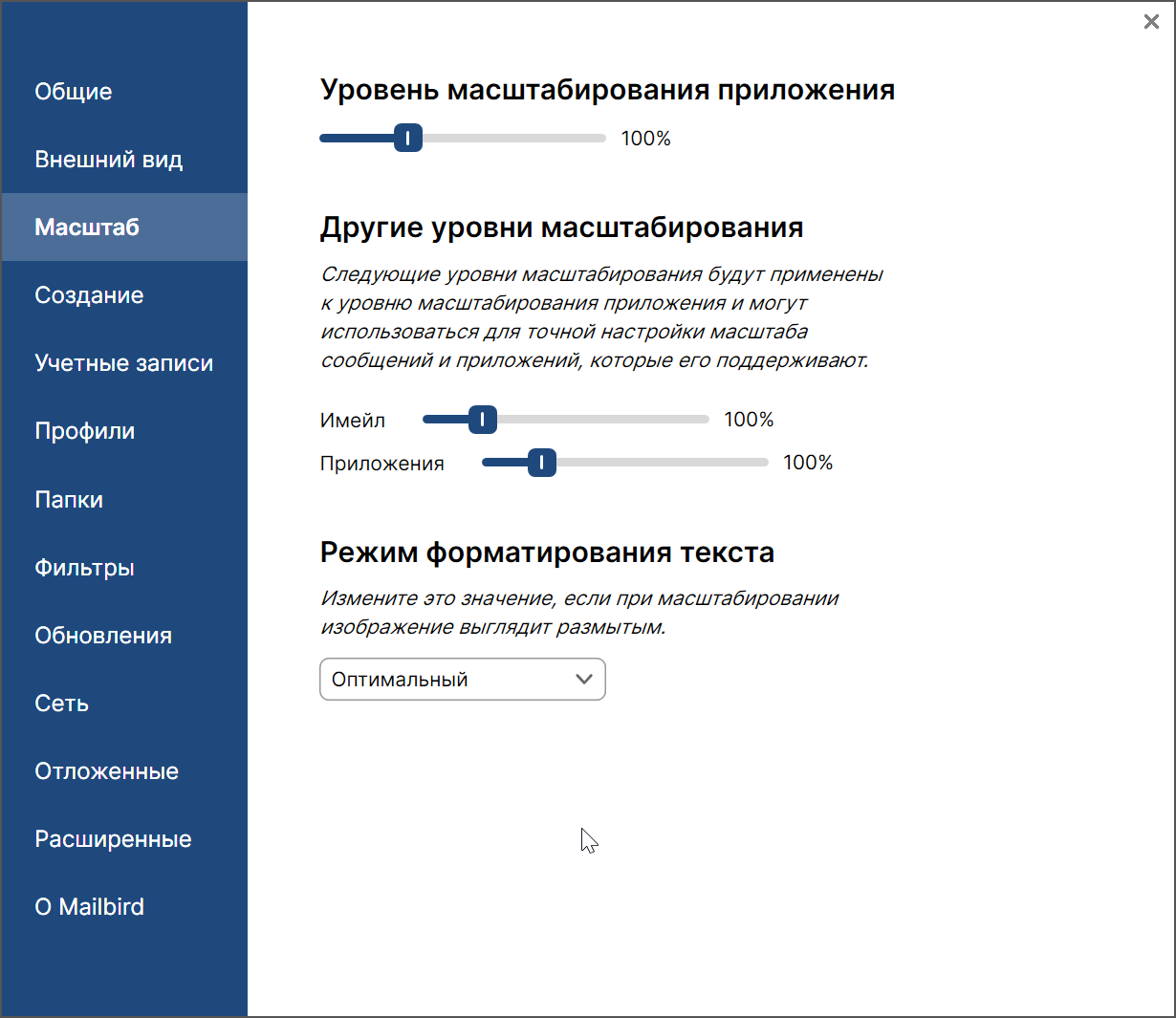 У меня Windows 11 и Ultrawide 5k монитор, на котором очень часто в приложениях размытые шрифты и текст не помещается в границы окон. В случае с Mailbird подобных проблем нет.