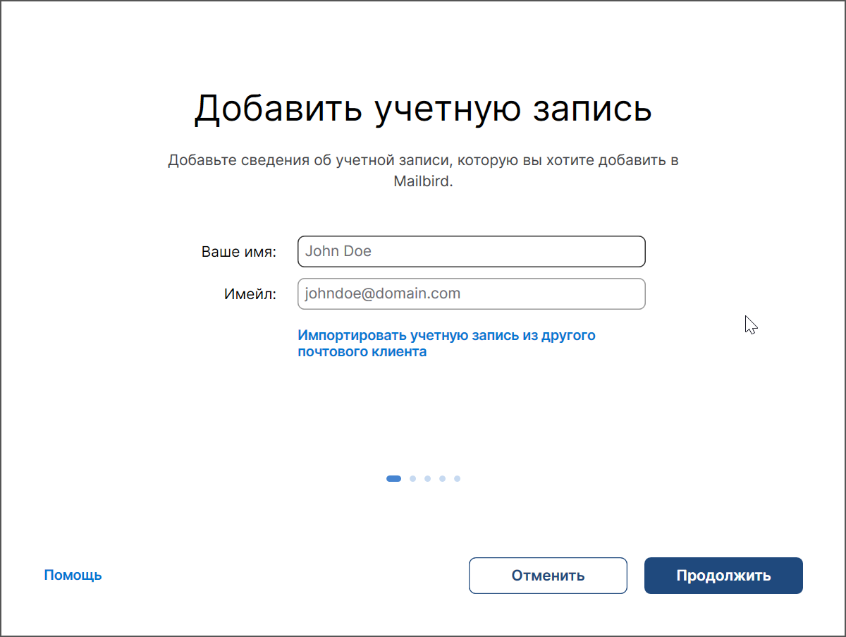Для настройки достаточно указать имя и адрес почты. На основе домена Mailbird определит, какие дальнейшие шаги нужно выполнить для настройки почты.