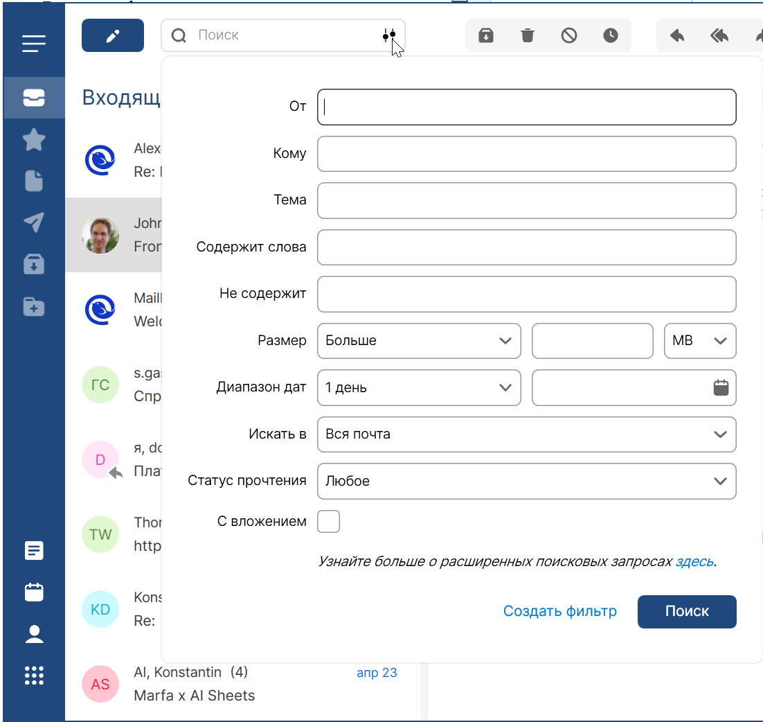 Для поиска старых писем в клиенте есть обычный поиск и поиск с гибкими фильтрами, которые помогают искать не только по содержимому и дате, но и по наличию вложений.