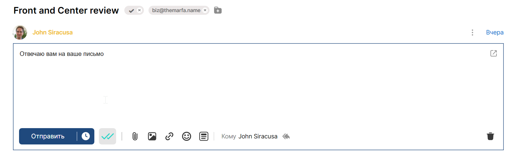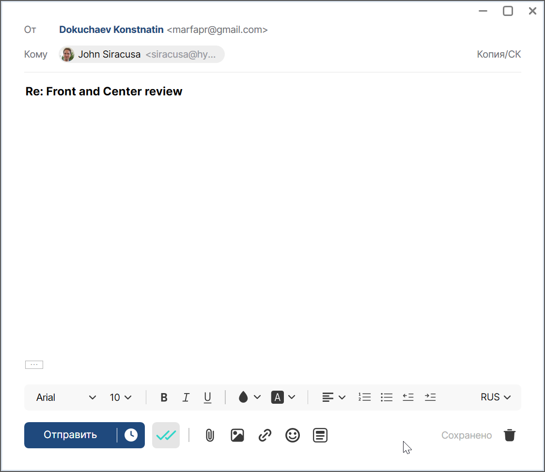 Сам редактор письма минималистичный и, на первый взгляд, не предлагает богатых функций для форматирования текста.