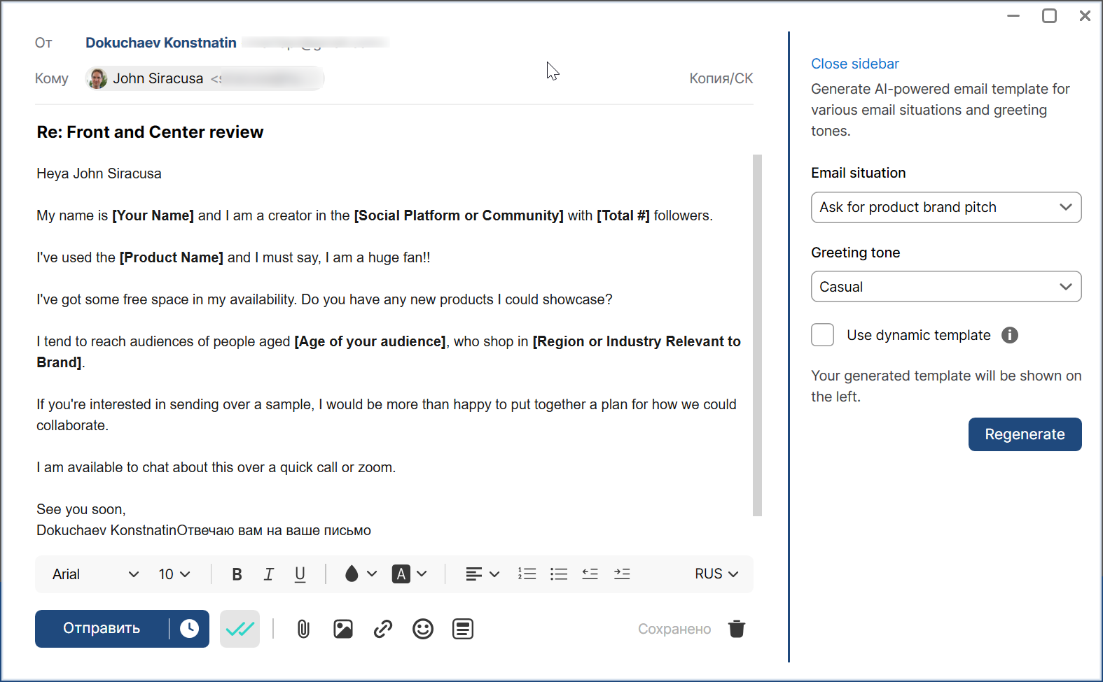 Для этого нужно выбрать ситуацию (контекст) переписки и тон общения, при необходимости можно подключить ChatGPT для генерации динамических шаблонов. А по нажатию на кнопку Generate вы получите новый шаблон.