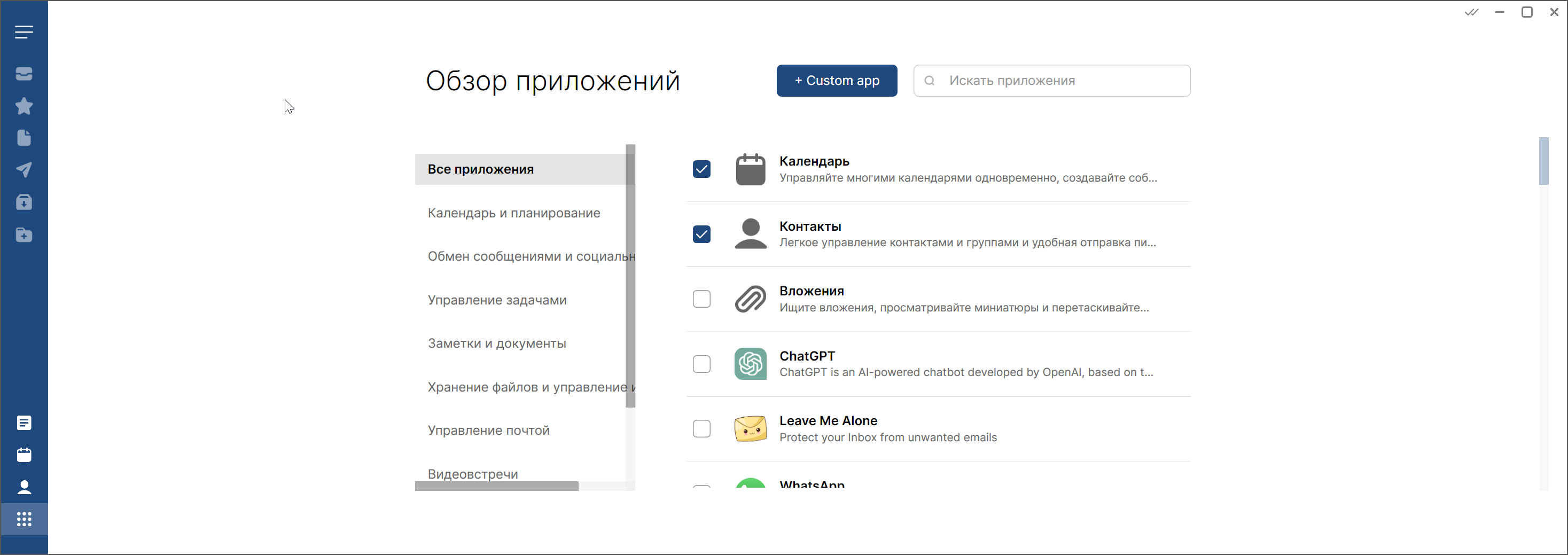 И именно в этом для меня заключается основное неудобство. Все приложения — это, по сути, иконки для открытия их веб-версии внутри Mailbird.