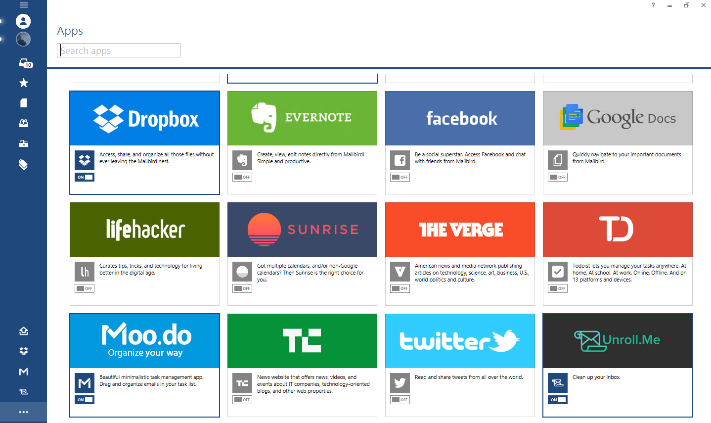 Так же в Mailbird есть несколько приложений. Со временем их должно стать больше, т.к. разрабатывать их может любой желающий.