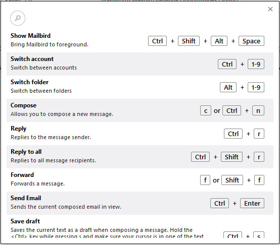 Сама работа с письмами ничем не отличается от любого другого почтового клиента. Программа так же вас оповещает обо всех входящих письмах. Вы так же отвечаете на письма. И прочее, прочее. Единственное, что вы не найдете здесь - это таких функций как фильтры, антиспам и подобное. Все это придется настраивать через веб-интерфейс вашего почтового провайдера. Ну, или воспользоваться таким сервисом, как Sanebox, обзор которого можно прочесть здесь. Но Mailbird кое-что выделяет на фоне других почтовых клиентов. Это горячие клавиши. Их здесь десятки. И все они направлены на одну единственную цель - пустая папка входящих. Скриншот внизу это лишь треть всех доступных сочетаний.