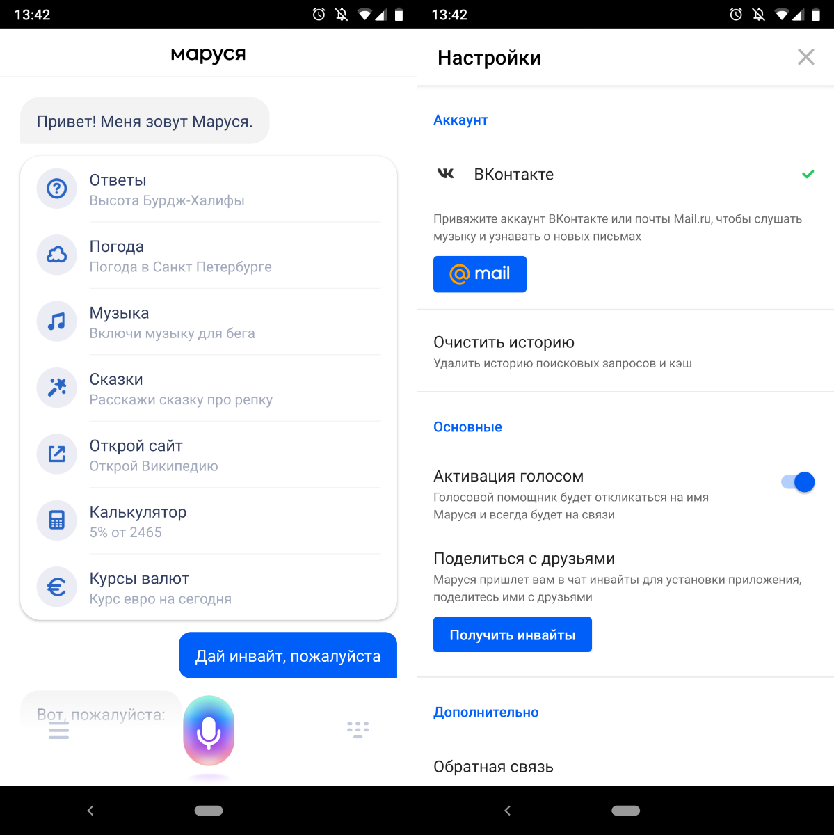 Настроек у ассистента минимум. Можно привязать свой аккаунт в VK или Mail.ru чтобы слушать музыку и получать оповещения о почте. Также можно отключить голосовую активацию.