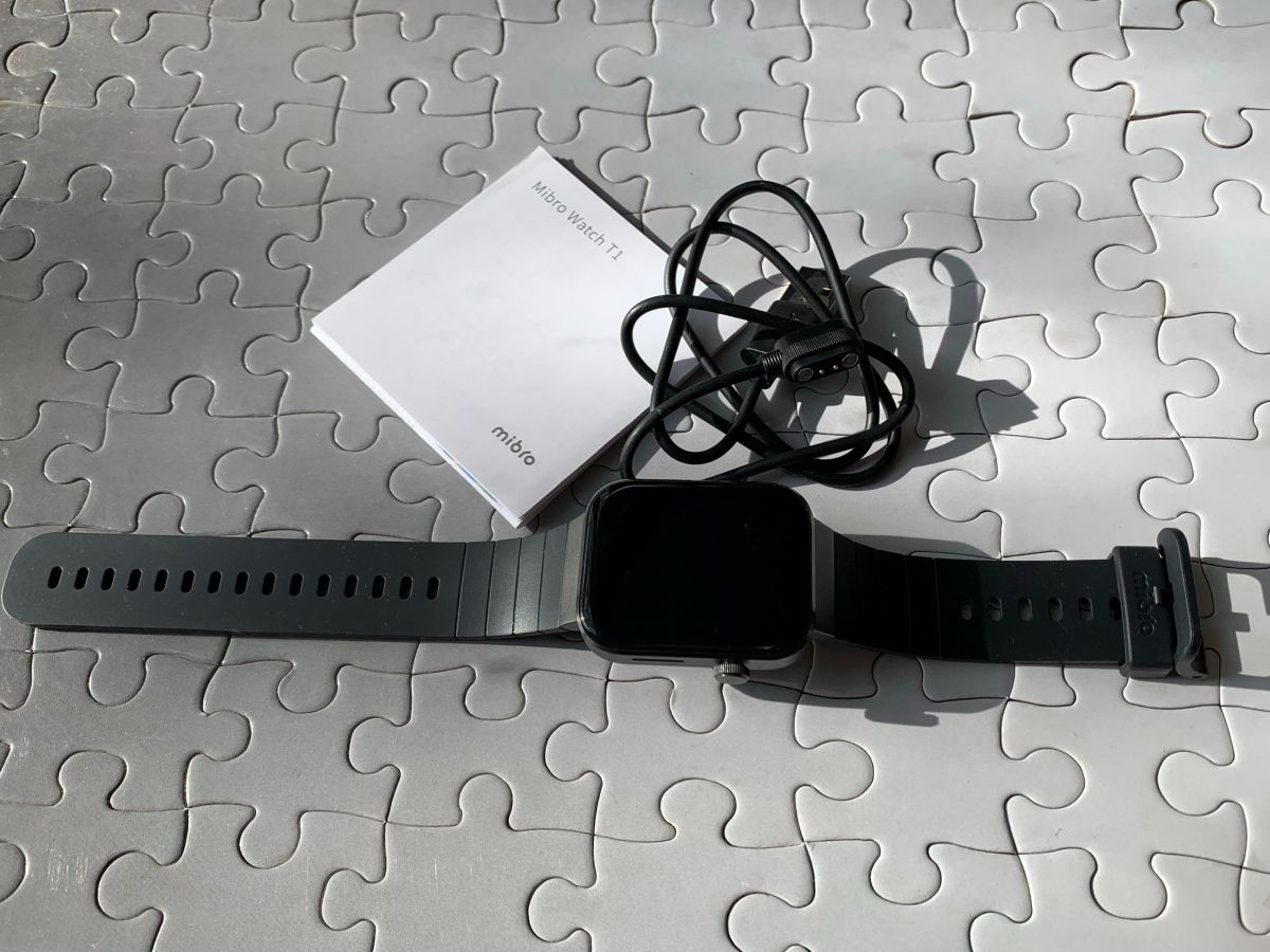 До написания обзора я не знал ничего об этой модели часов и сколько они стоят. Mibro T1 приходят в чёрной коробке, от которой у меня были ожидания модели из среднего ценового сегмента. Внутри оказались довольно простые на вид часы, провод для зарядки и инструкция.