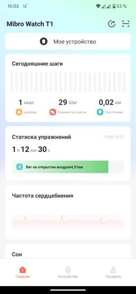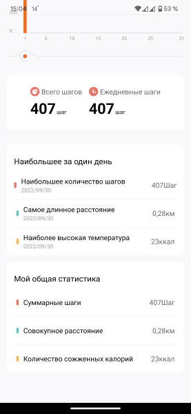 Останавливаться подробно на приложении я не буду. Во-первых, к самим часам оно имеет мало отношения и предназначено для управления любыми часами от Xiaomi. А во-вторых, после первоначального подключения и выбора циферблата я им не пользовался вообще. Хотя в нём удобно просматривать статистику по вашим упражнениям.