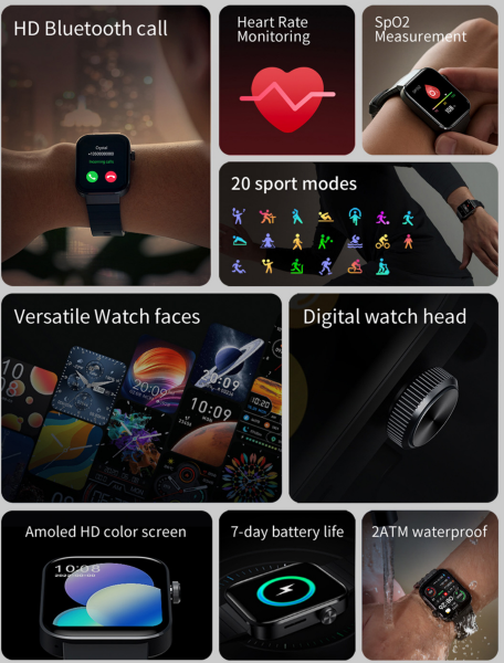 В часах нет поддержки GPS и SIM-карты. Зато есть: Bluetooth 5.0, динамики, микрофон, поддержка 20 спортивных режимов, датчики сна, пульса, кислорода.