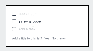 Список дел. Это простой чек-лист с возможностью перетаскивания задач. Можно добавить заголовок, исполнителя, дату.