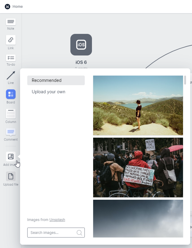 Изображения и файлы. Как я и говорил, можно добавлять изображения и файлы популярных форматов. При выборе изображения есть интеграция с фотостоком Unsplash.
