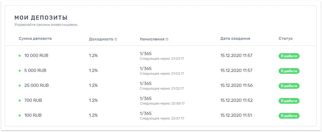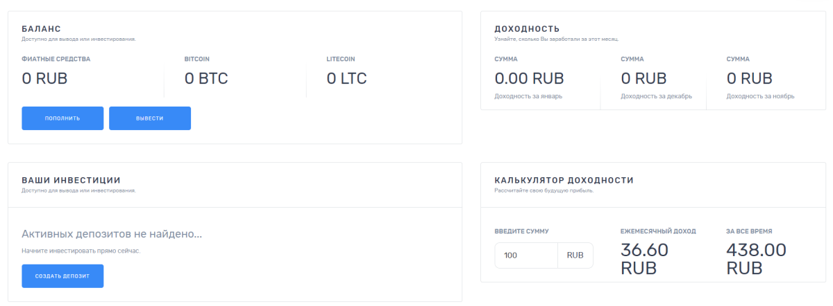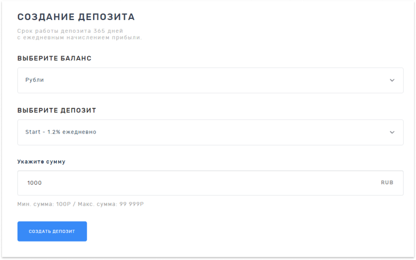 Далее нужно создать депозит. Это будет вашей суммой инвестирования. Кстати, прибыль можно выводить в любое время.