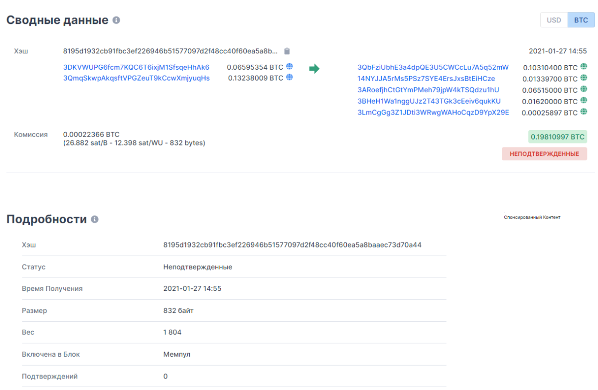 Вот, к примеру, часть данных о транзакции самой анонимной в мире валюте Bitcoin.