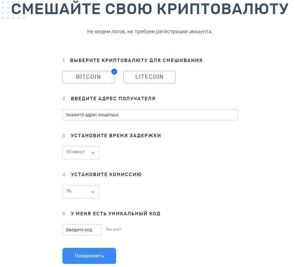 Найти инструмент микшера немного сложно, поэтому вот прямая ссылка. Дальше всё довольно просто. Вы можете выбрать для смешивания Bitcoin или Litecoin.