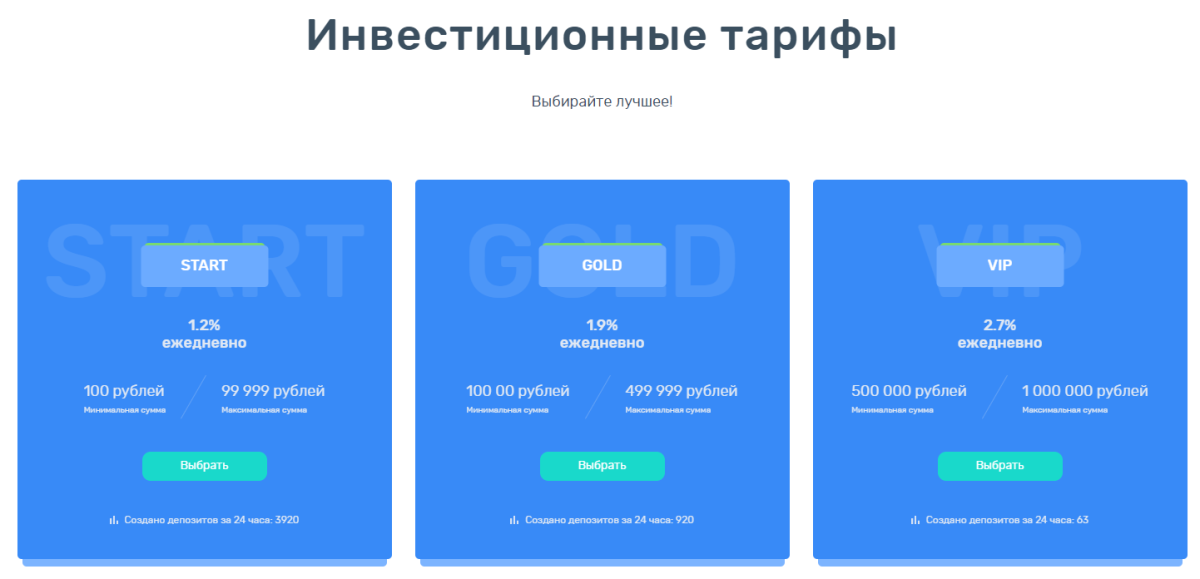 Mixereo предлагает три инвестиционных тарифа. Минимально можно вложить 100 рублей и получать доход в 1,2% ежедневно. А максимально — миллион рублей и 2,7% дохода.