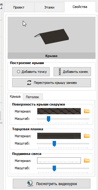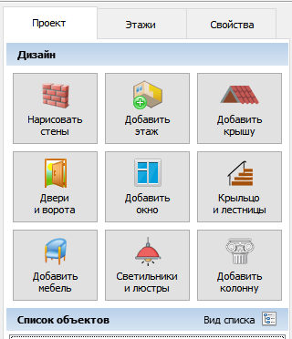 На первой вкладке вы можете добавить нужный элемент постройки, и затем разместить её на плане. Элементы позволяют легко отрисовать полноценный проект дома. Здесь есть различные дизайны стен, крыш, дверей, окон, крылец, лестниц, мебели, освещения и колонн.
