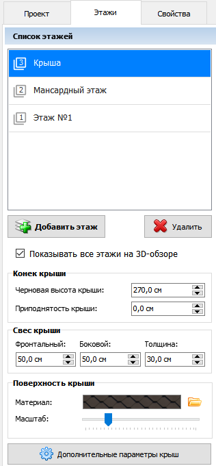 На вкладке Этажи аналогичным образом можно управлять этажами: добавлять, удалять, переименовывать и изменять их свойства.