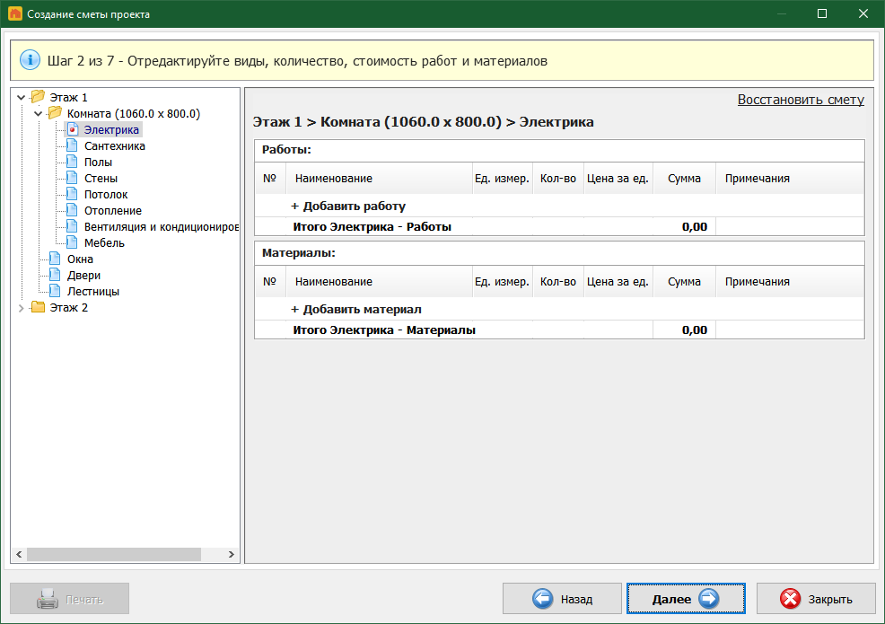По завершении разработки дизайна в отдельном мастере можно составить смету проекта. При этом в неё уже автоматически будут включены все добавленные к проекту элементы. А от вас требуется только добавить их и указать стоимость.
