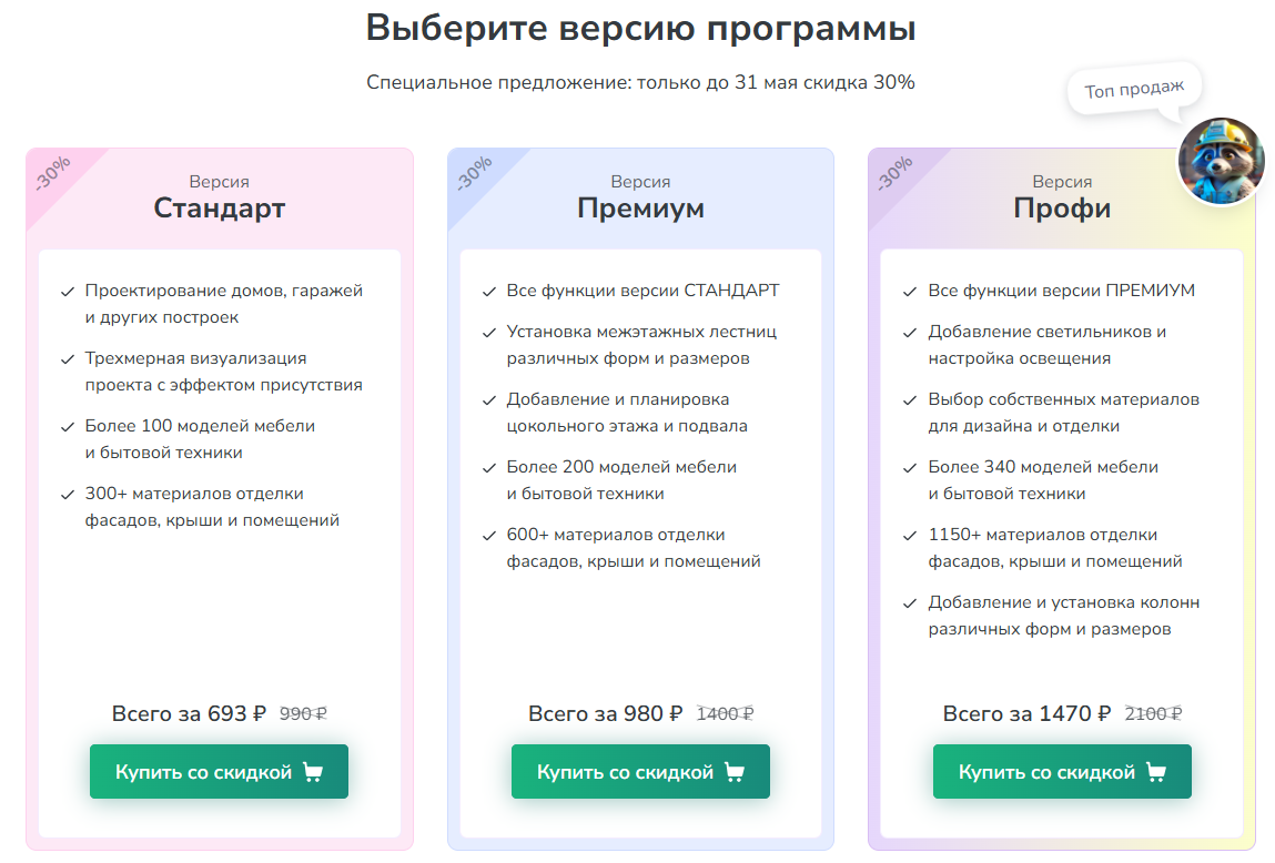 Если вы решите приобрести лицензию, то её стоимость начинается от 693 рублей за версию Стандарт. Версии между собой отличаются количеством материалов и мебели, а также некоторыми доступными возможностями. Поэтому я рекомендую внимательно ознакомиться со списком различий на отдельной странице приложения.