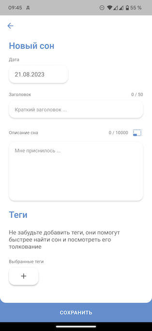 Записывать сны можно в разделе Мой дневник. Здесь всё просто и без каких-либо хитростей. При добавлении нового сна можно указать его дату, добавить заголовок (до 50 символов), описание (до 10 000 символов) и теги.