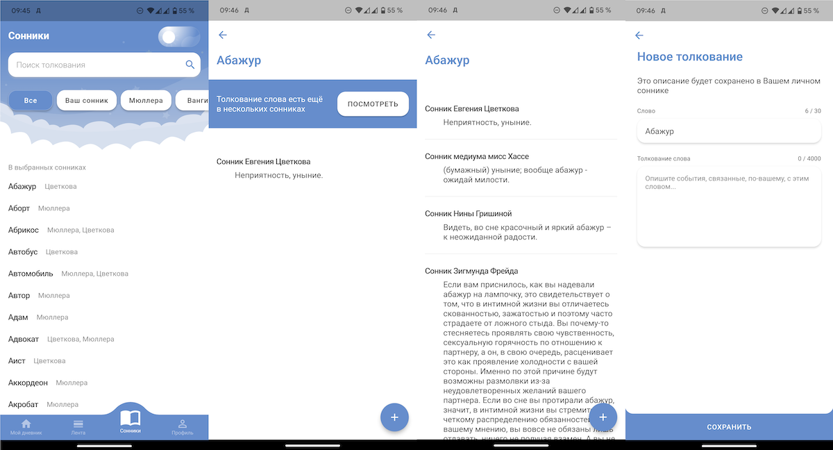 Но сразу при переходе в раздел отображаются значения из всех включённых сонников с возможностью поиска по ним. Рядом со словом видно, в каких сонниках есть трактование. При тапе по нему можно прочесть значение или перейти к описанию во всех остальных сонниках. А ещё можно добавлять собственные трактования.