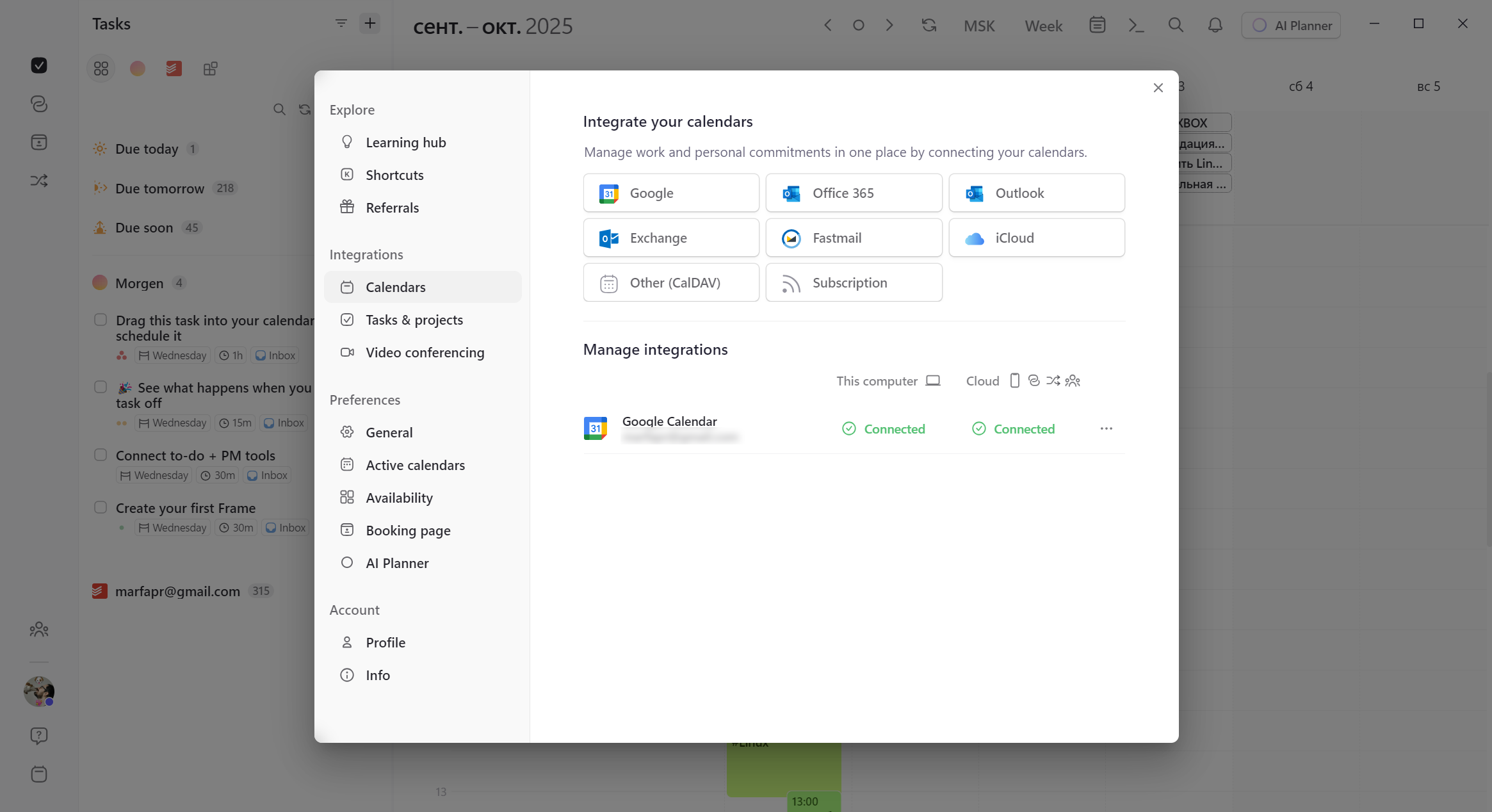 При первом запуске morgen нужно сразу же подключить календарь, менеджер задач и приложение для созвонов. Конечно, каждый из этих этапов можно пропустить, но тогда сервис не сможет получать данные о ваших планах.