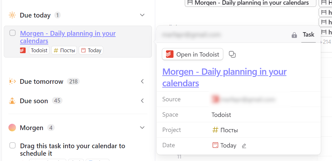 С помощью сервиса вы можете управлять задачами и встречами в подключённых приложениях из единого окна. Например, если вы работаете с таской из ToDoist, то в её карточке вы увидите соответствующие поля.